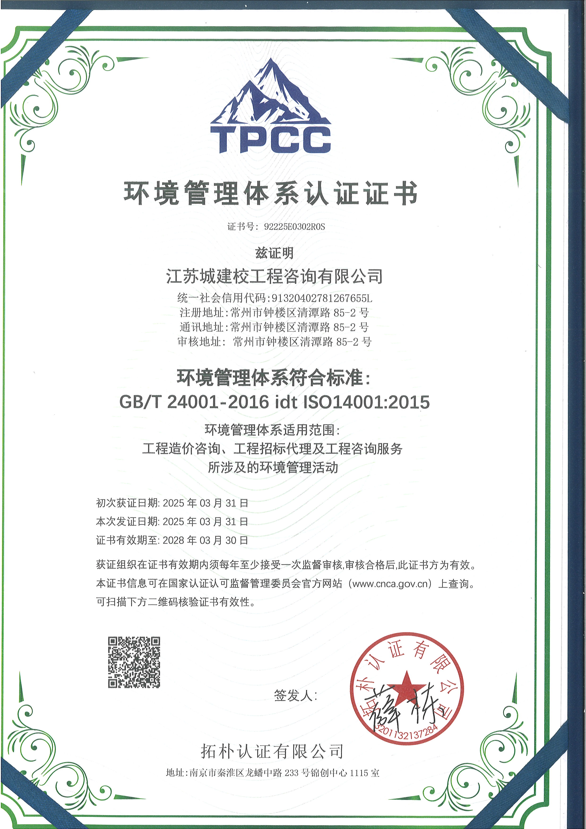 环境管理体系认证证书