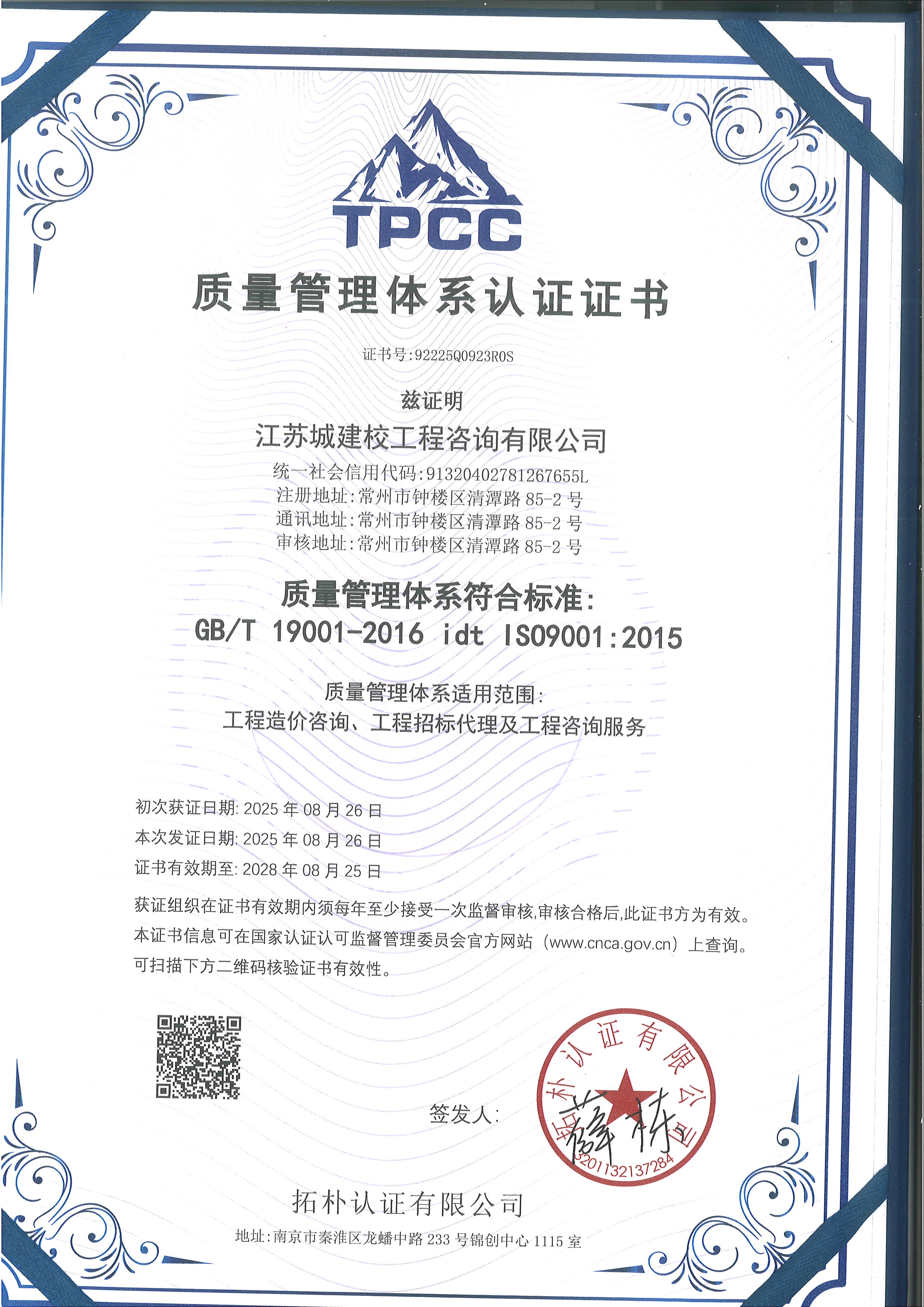 质量管理体系认证证书